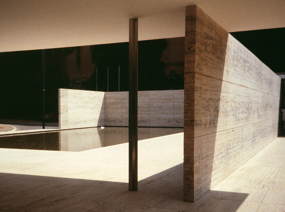 modernism. The German Pavilion had been built for the Exposició Internacional de Barcelona in 1929, by the architect Ludwig Mies van der Rohe, together with Lilly Reich. They designed it as a lightweight, low-lying one-storey structure raised on a podium, with a cantilevered roof hovering over an asymmetric open plan of planar walls allowing interior and exterior courts and pools to interpenetrate. Only the best materials were used, including reflective grey and green glazing, green marble and yellow onyx in the walls and partitions, travertine in the paving, and chrome-plated steel in the columns. A single sculptural addition, Georg Kolbe's allegorical female called Dawn, rested on a plinth inside the smaller water basin. Its figure complemented and contrasted with the avant-garde exercise in geometry and bold reduction of form, even while it pointed to the classical foundations of a practice that was otherwise revolutionary.