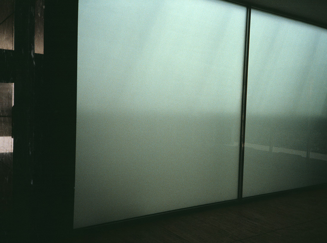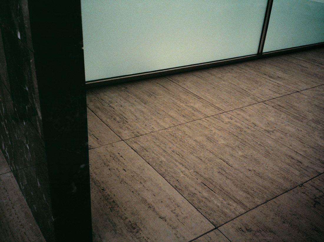Albeit attracted to the iconic aspects of the celebrated building—the materials (marble, glass, and metal), the key spaces, and light—they seem like asides, as her focus is more ambient and on the mundane. She uses photography in a subjective way, where her "less is more" compositions are less about describing these sober and rational spaces, than they are about a poetics of space, and about being in them.